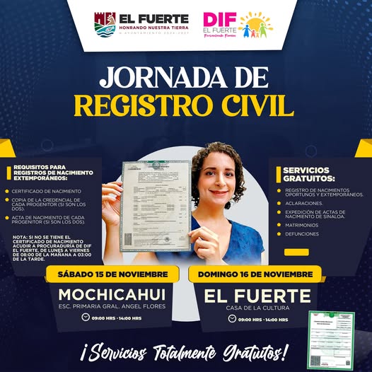 El H. Ayuntamiento de El Fuerte y el DIF El Fuerte te invitan a participar en esta jornada donde podrás realizar diversos trámites totalmente gratuitos.Servicios disponibles: Registro de nacimientos oportunos y extemporáneos Aclaraciones Expedición deLeer más -